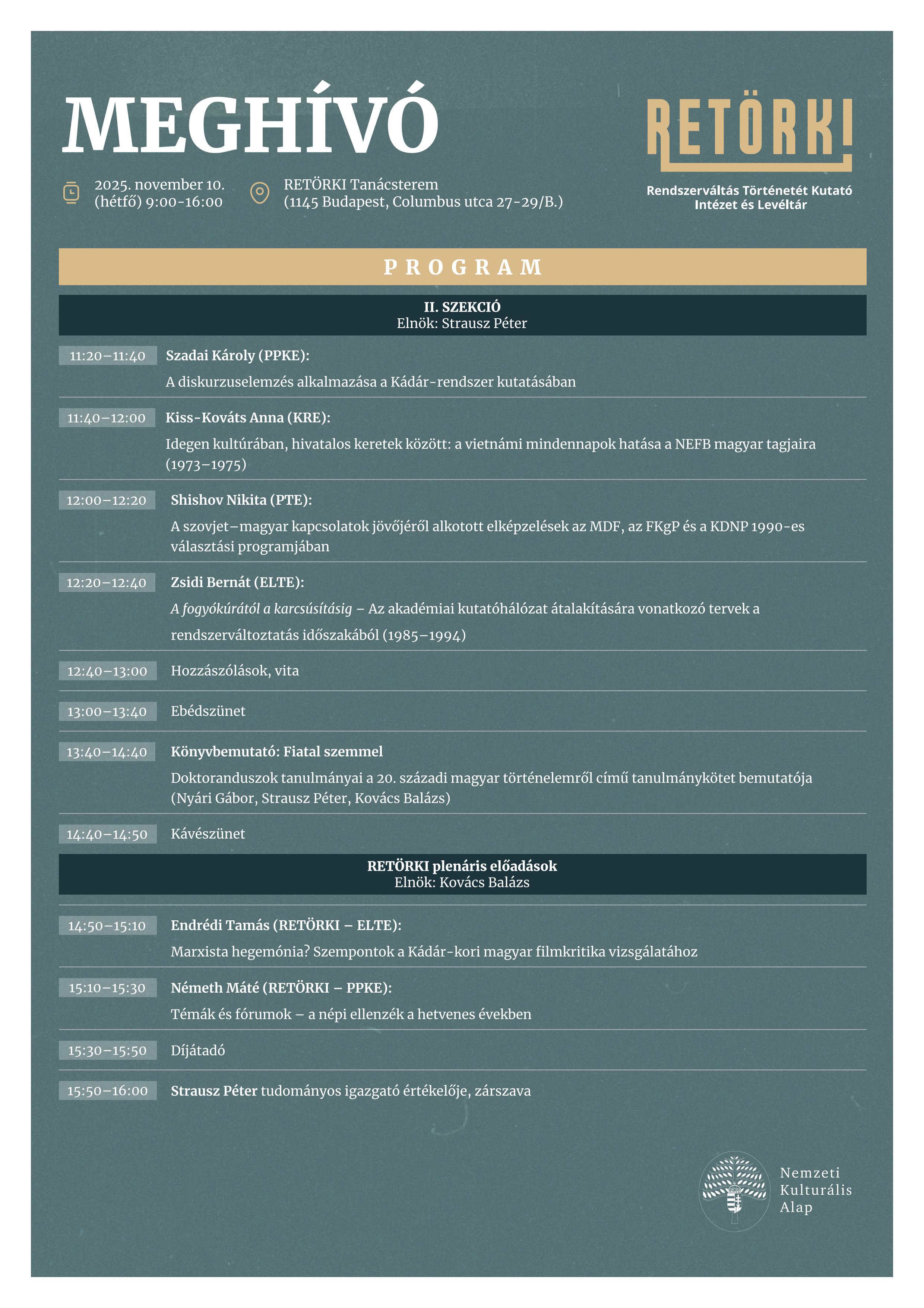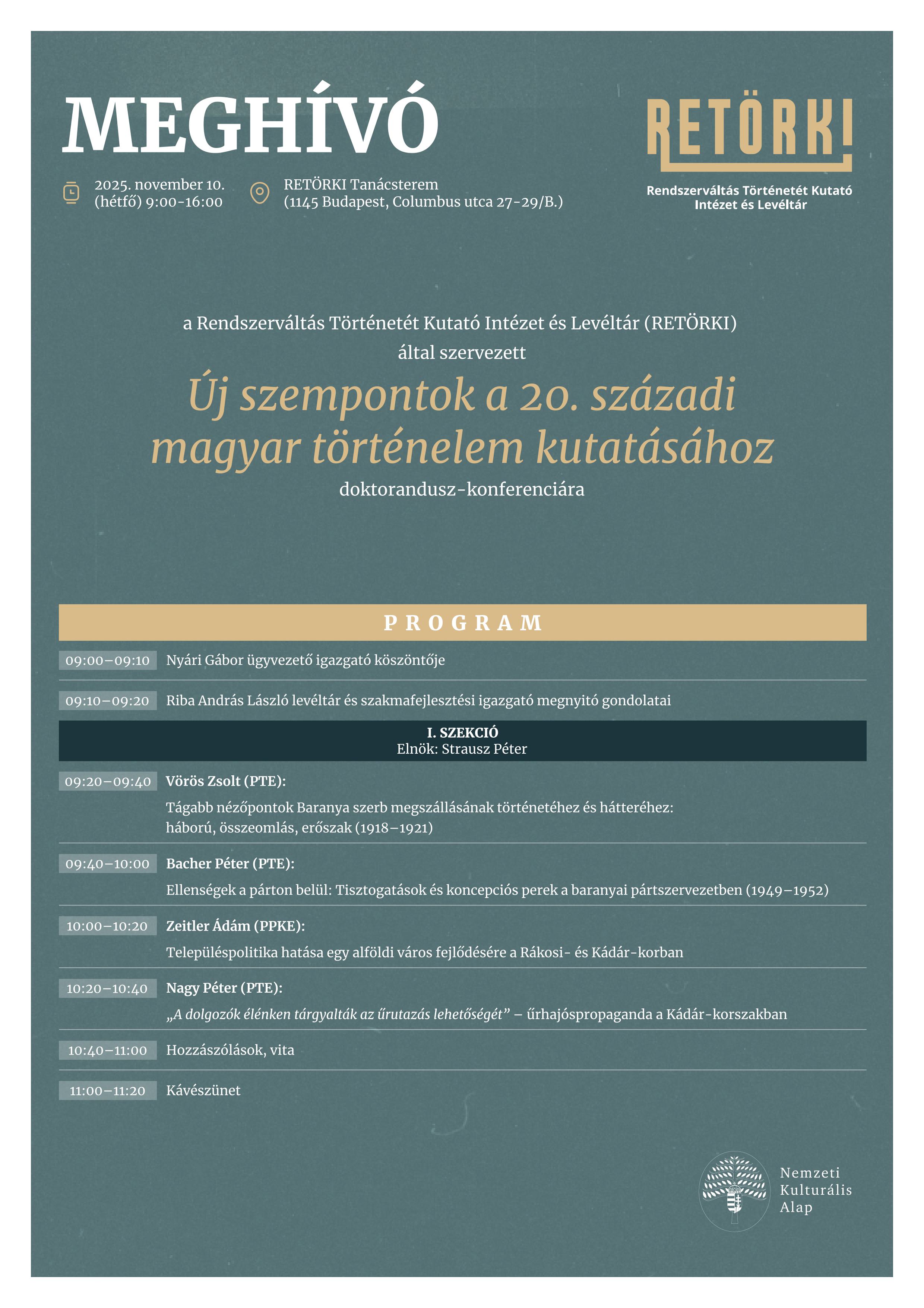 A 20. századi magyar történelem kutatásához kínált új szempontokat a Rendszerváltás Történetét Kutató Intézet és Levéltár. A 2025. november 10-én megrendezett doktorandusz-konferencia többek között a Rákosi és Kádár-kori településpolitika kutatásához, Baranya megye szerb megszállásának történetéhez és hátteréhez, a párton belüli tisztogatások és koncepciós perek történetének feldolgozásához járult hozzá újszerű szempontokkal. Szadai Károly, a Médiatanács tagja a diskurzuselemzés alkalmazásával emelt be új jelentés-rétegeket az értelmezés keretei közé a Kádár-rendszer kutatásában.