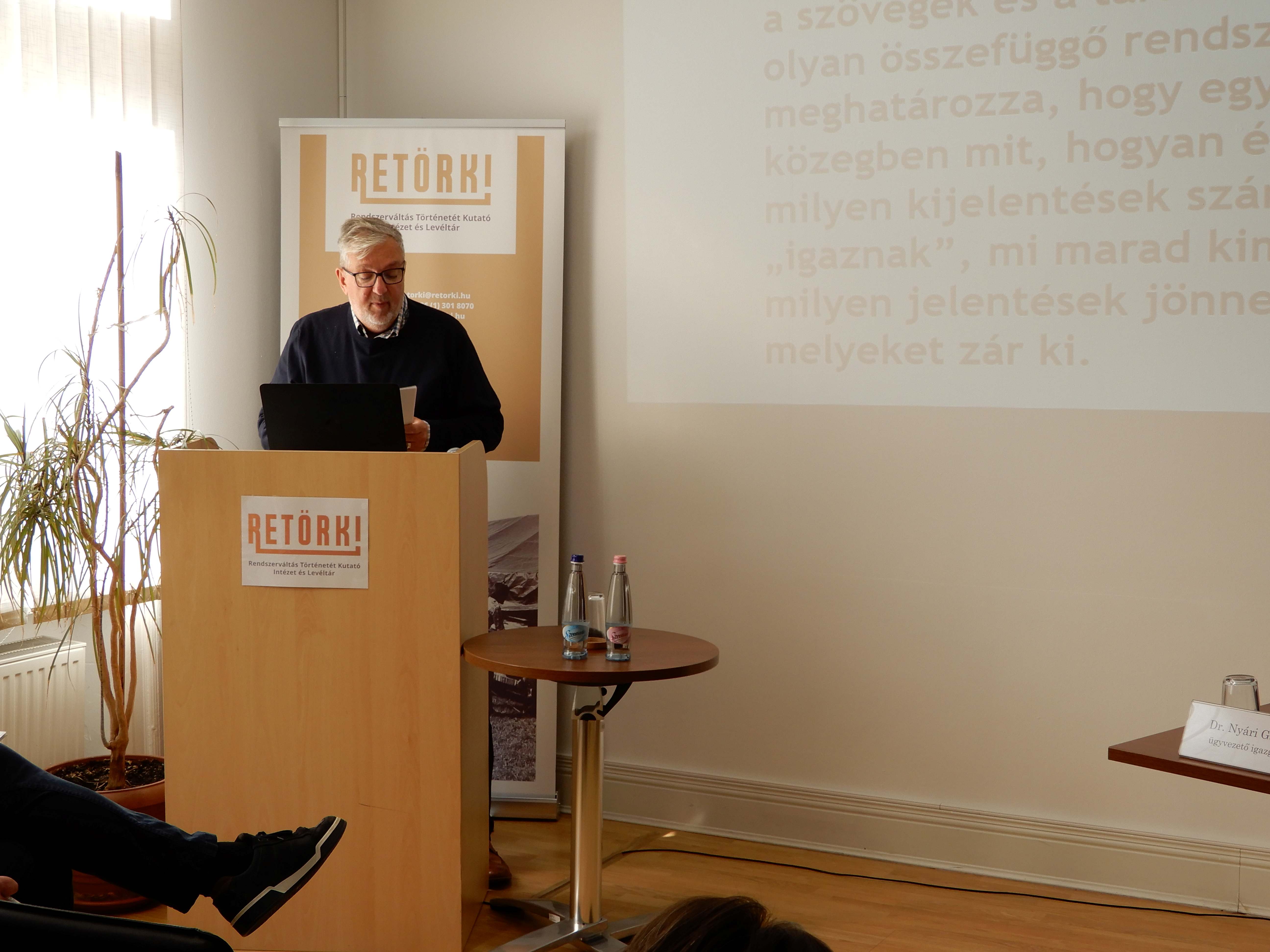 Előadásában a nyelv társadalmi használatát vizsgálata, mely rávilágít a nyelv valóságot szervező voltára: A »diskurzus« társadalomelméleti fogalomként a jelentések és narratívák, a politikai küzdelmek színtere. Ez a nézőpont a nyelvet olyan hatalmi eszköznek tekinti, amely nem csak segít a hatalom gyakorlóinak behatárolni egy társadalomban az elképzelhető diskurzusok körét, de megszabja azok kereteit is, annak érdekében, hogy a hatalmat megőrizhessék, sőt újratermeljék. Az előadás központi kérdésként tárgyalta, hogy vizsgálható-e kritikai attitűddel az, ahogyan a Kádár-rendszer hatalmi elitje átalakította a baloldali rendszerkorrekciós diskurzust, a rendszer megváltoztatását célzó liberális diskurzussá annak érdekében, hogy a régi rendszerben felhalmozott hatalmi pozícióit átmenthesse az új rendszerbe.
