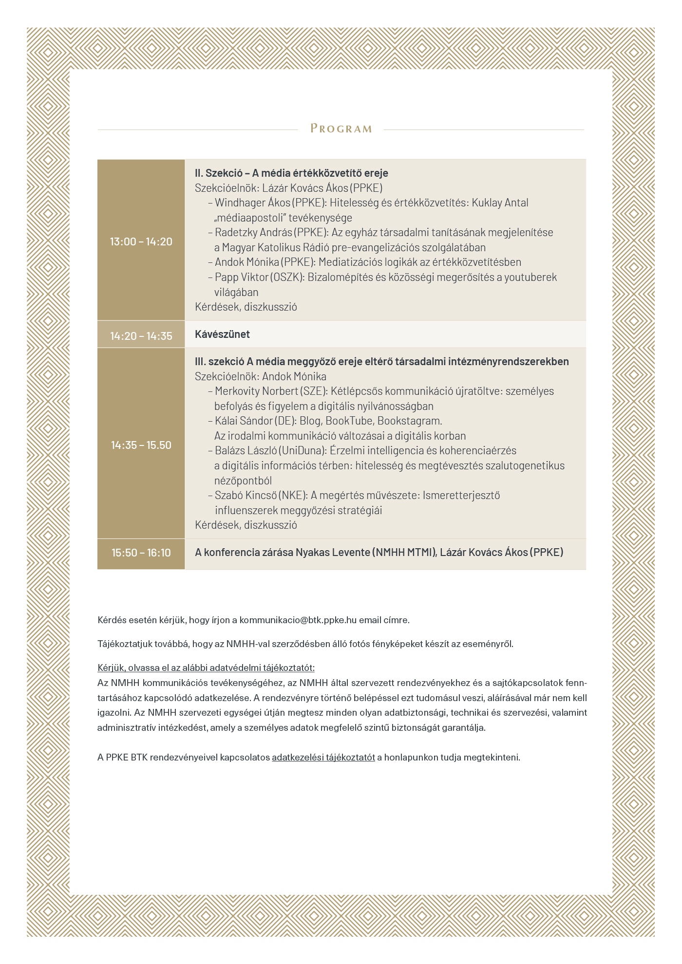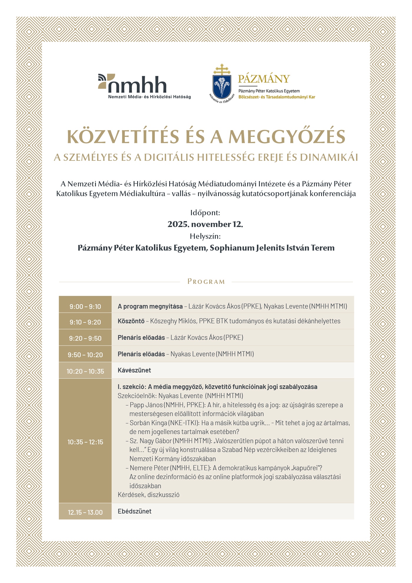 A Nemzeti Média– és Hírközlési Hatóság Médiatanács Médiatudományi Intézete, valamint a Pázmány Péter Katolikus Egyetem Kommunikáció- és Médiatudományi Intézetének Médiakultúra – vallás – nyilvánosság kutatócsoportja 2025. november 12-én konferenciát szervez Közvetítés és a meggyőzés. A személyes és a digitális hitelesség ereje és dinamikái címmel. Az idei immár negyedik közös éves konferenciája a két intézménynek.