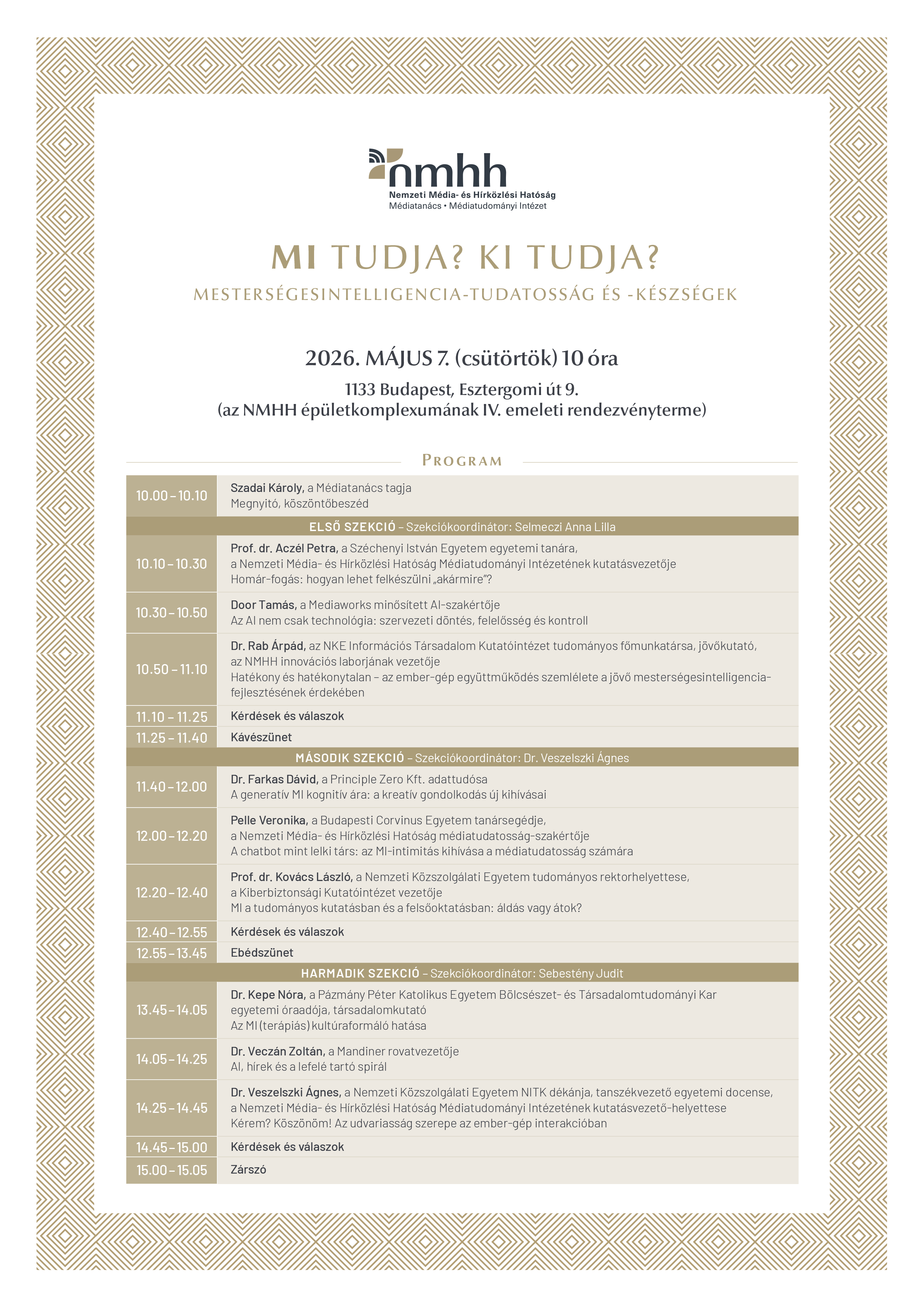 | 10.00–10.10 | Szadai Károly, a Médiatanács tagja Megnyitó, köszöntőbeszéd |